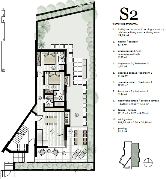 69m2 internal surface area, 18m2 terrace, 12,5m2 parking place