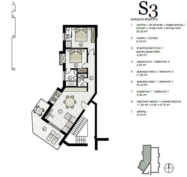 69m2 internal surface area, 15m2 covered balcony, 12,5m2 parking place