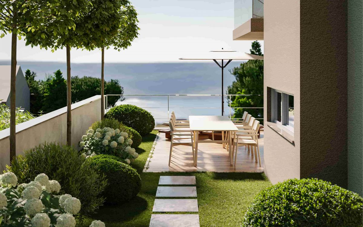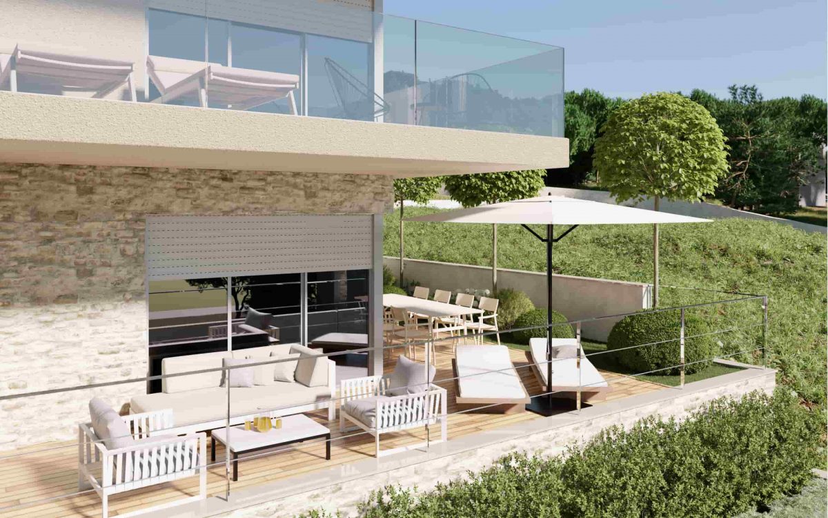 Each apartment contain two bedrooms, open space of the kitchen and living room and two bathrooms with laundry/guest toilet. Apartments on the ground floor have spacious terraces and garden with enough space for summer kitchen with barbecue and jacuzzi. Apartments on upper floors offer covered balconies with beautiful views on surrounding islands and sea.