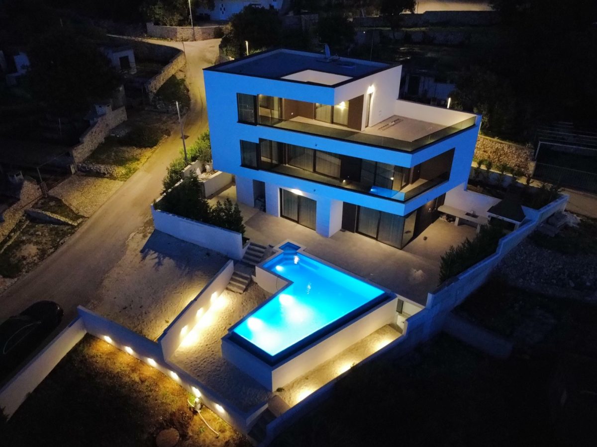Extraordinary “Diamond” shape Villa located in Stivasnica Bay, area of Rogoznica. Located just 100 meters from the sea with stunning view on Adriatic from every floor and positioned just on the point where two local roads are merging into dead end road to make it easy accessible and luxury residence with full privacy!