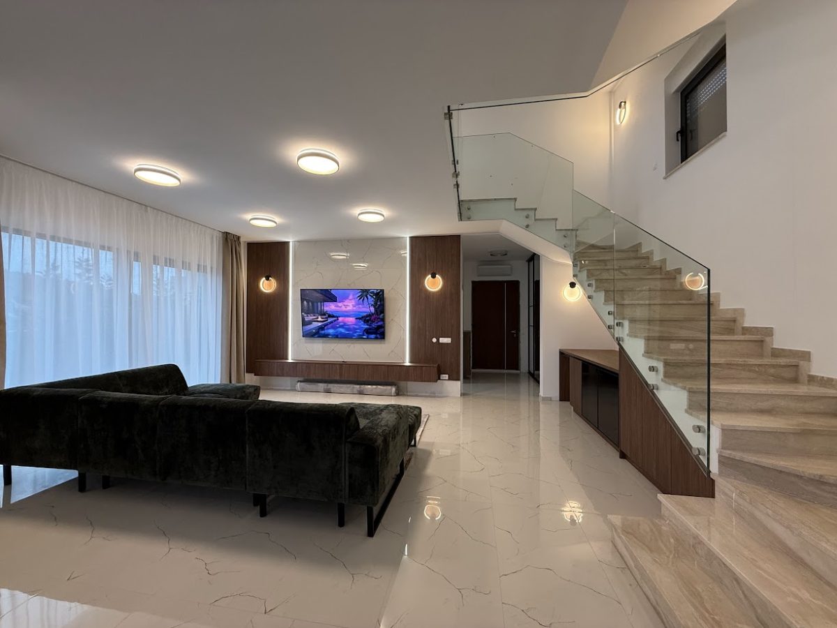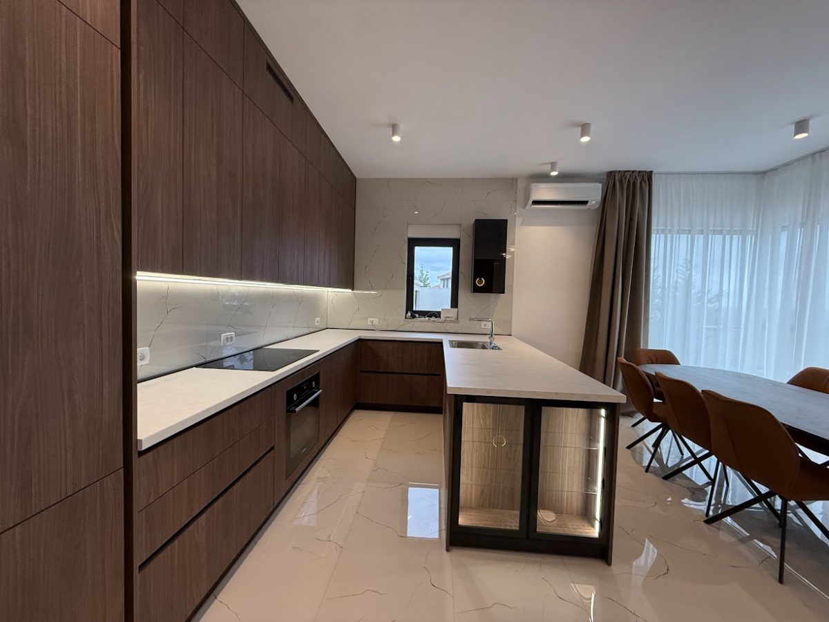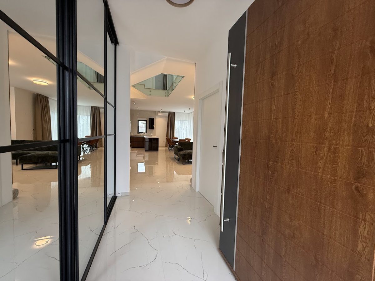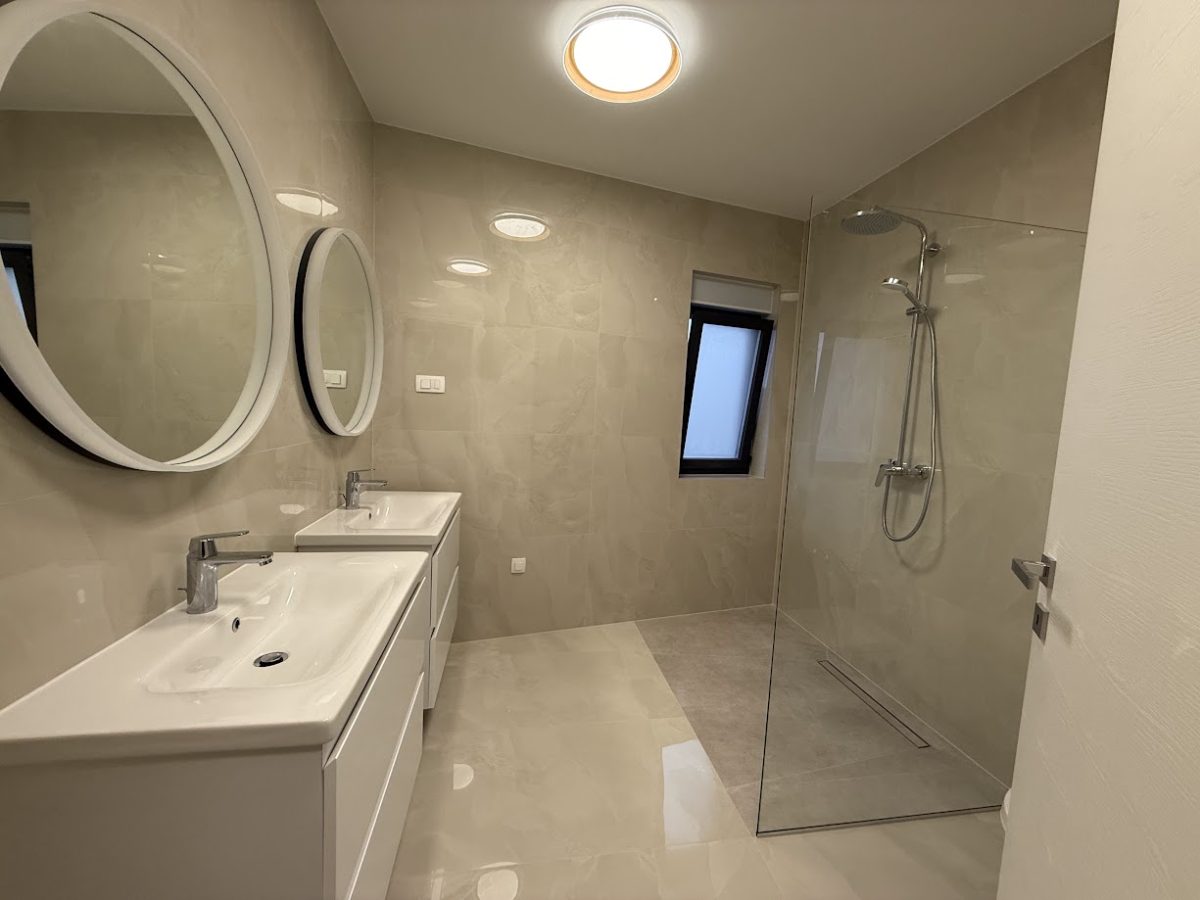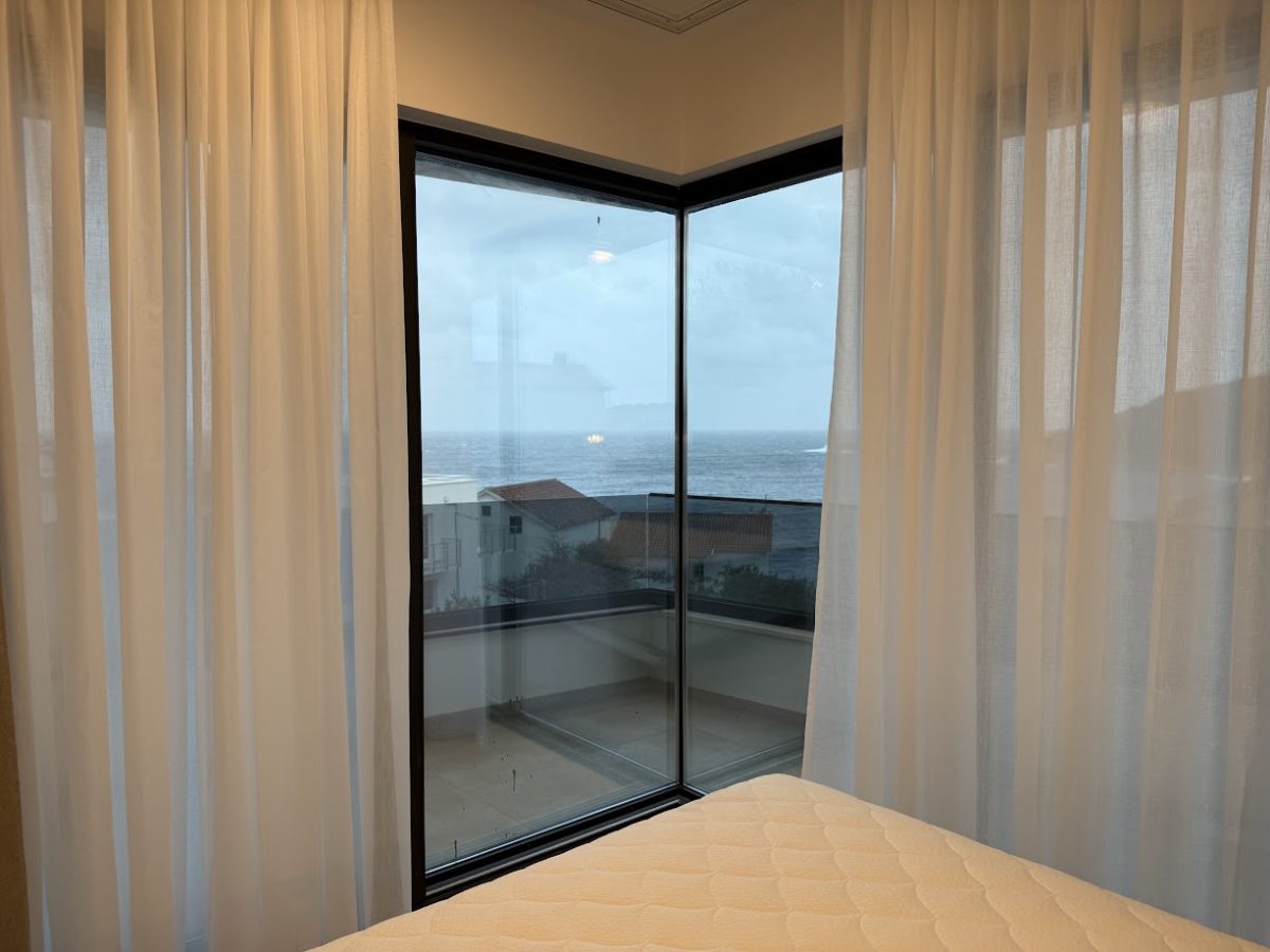 Entrance to this property is on a northern side, located above level of ground floor and getting down the main door area with few steps from the parking lot. In the ground floor is located toilet, storage room, spacious living room with kitchen and big terrace with an amazing infinity pool, summer kitchen and outdoor dining area. Position of sofa and dining table offer stunning sea view through big glass sliding doors. U shaped infinity pool has jacuzzi area with massage pumps and is positioned on same level as ground floor.