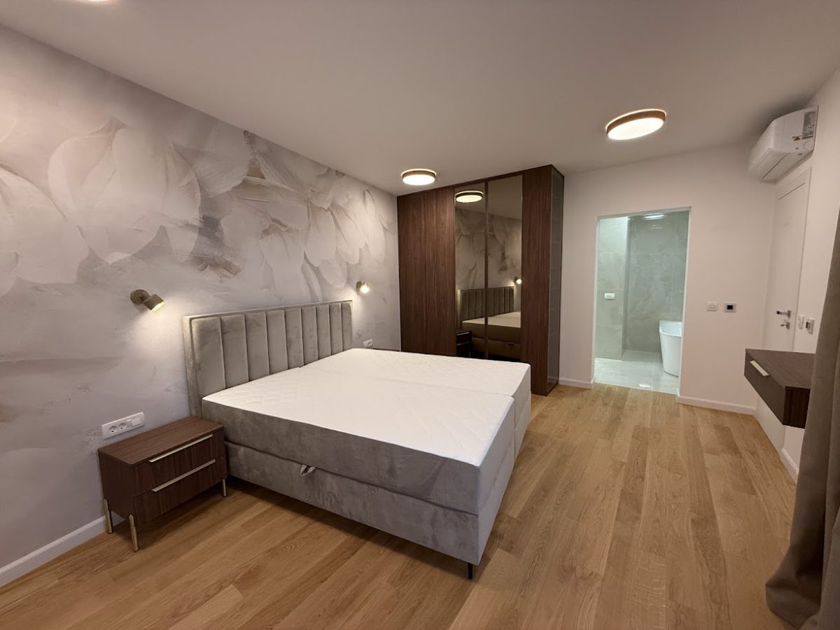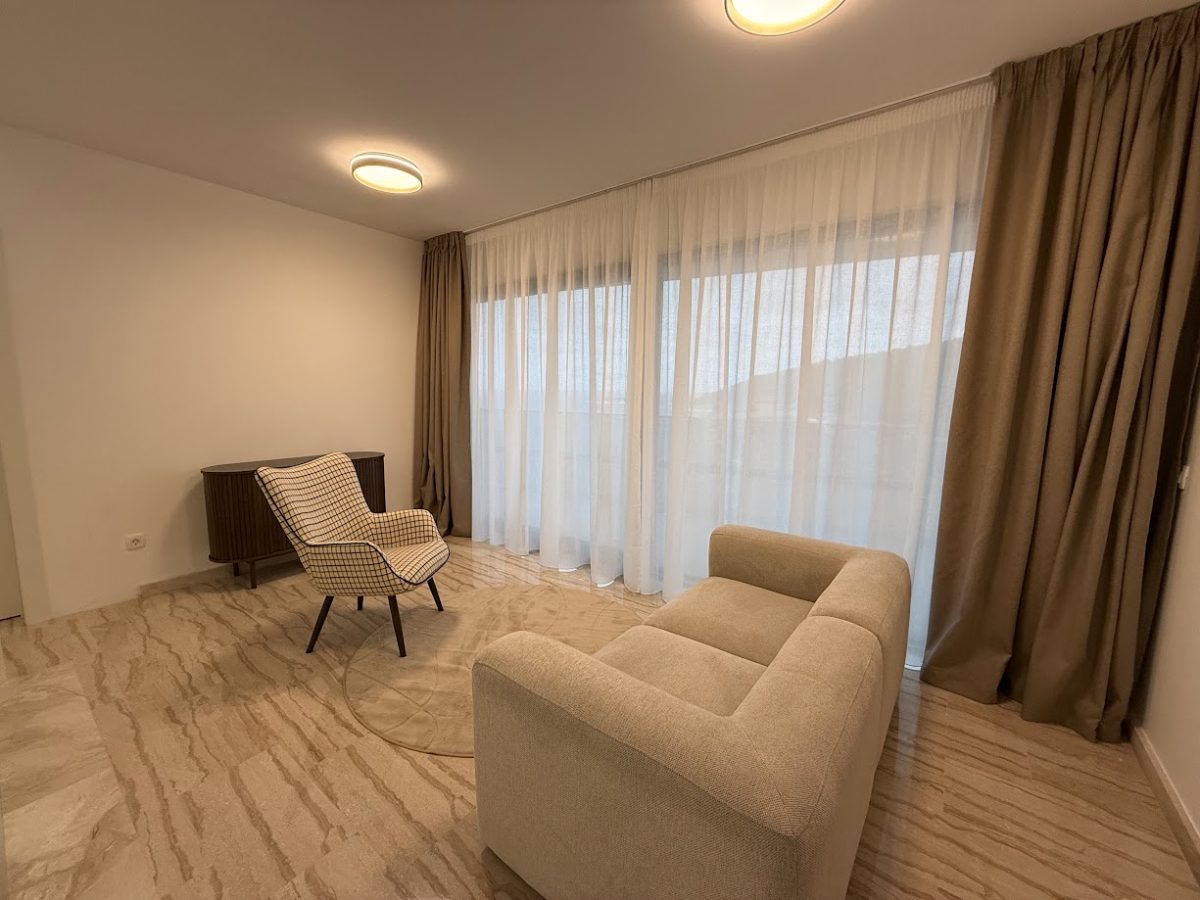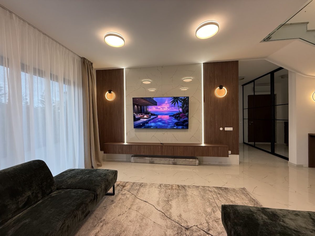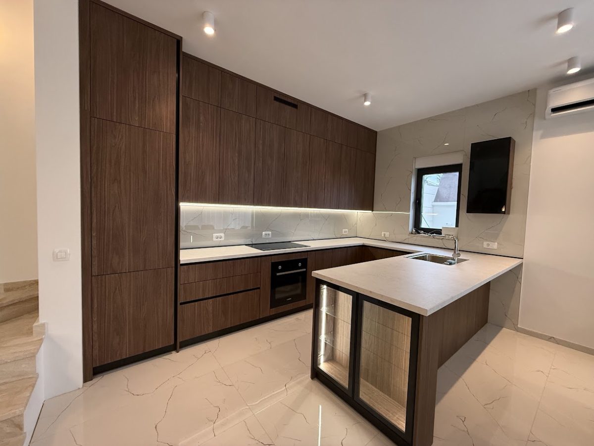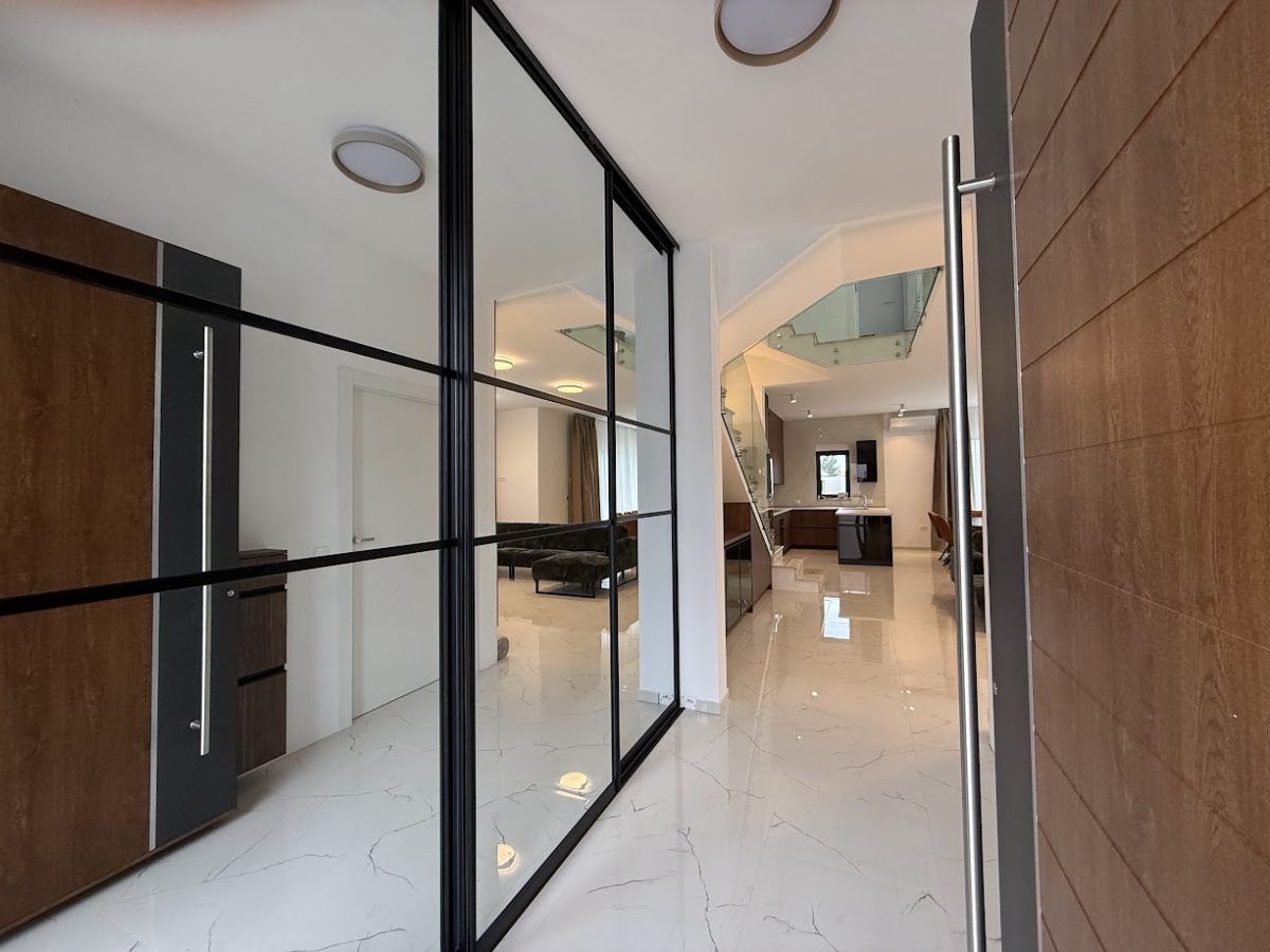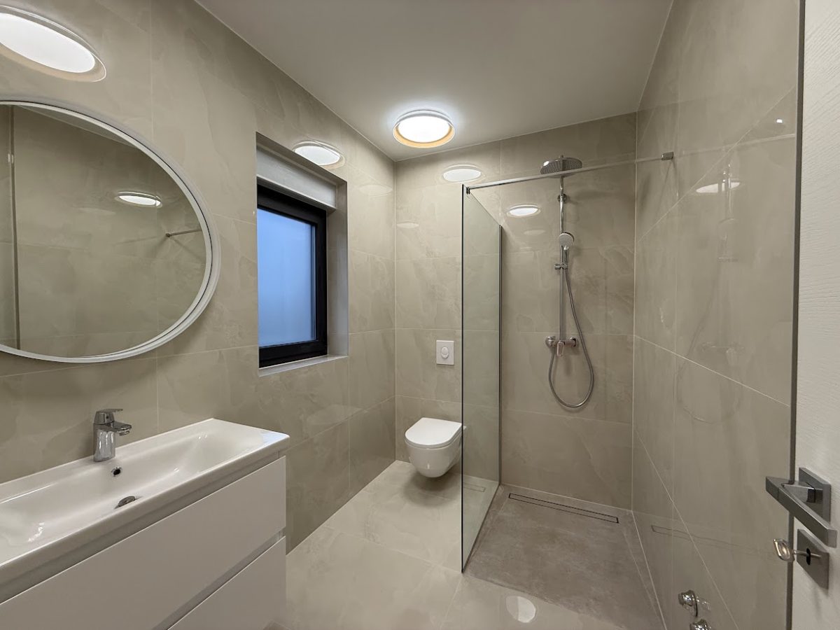 Entrance to this property is on a northern side, located above level of ground floor and getting down the main door area with few steps from the parking lot. In the ground floor is located toilet, storage room, spacious living room with kitchen and big terrace with an amazing infinity pool, summer kitchen and outdoor dining area. Position of sofa and dining table offer stunning sea view through big glass sliding doors. U shaped infinity pool has jacuzzi area with massage pumps and is positioned on same level as ground floor.