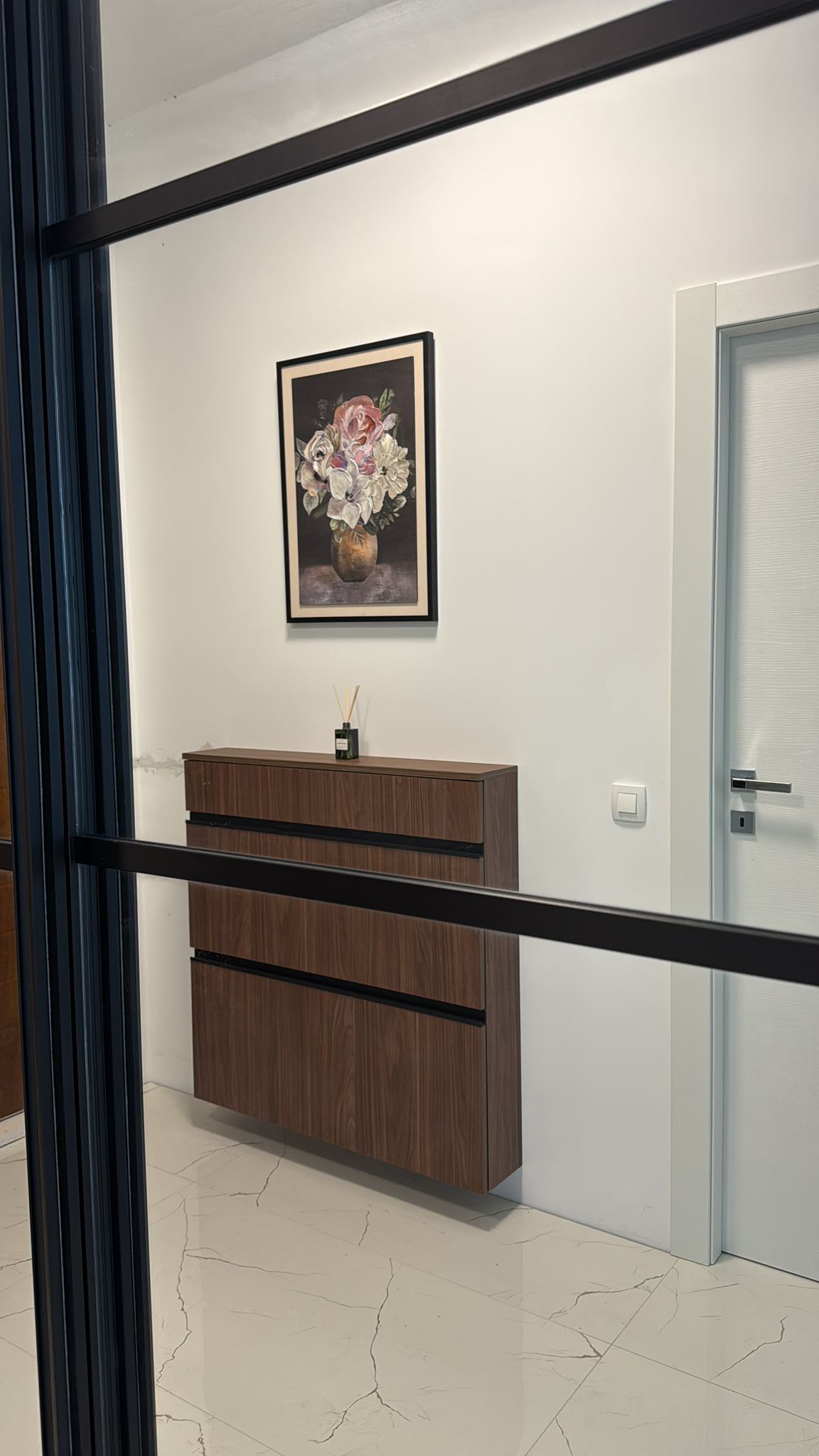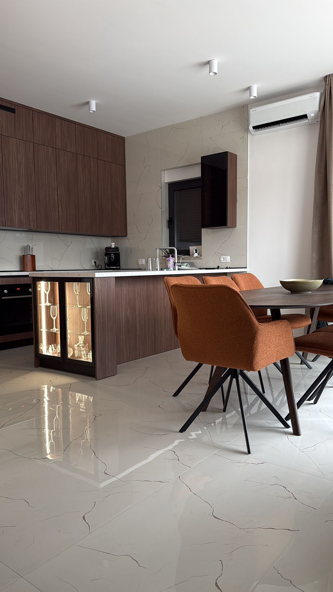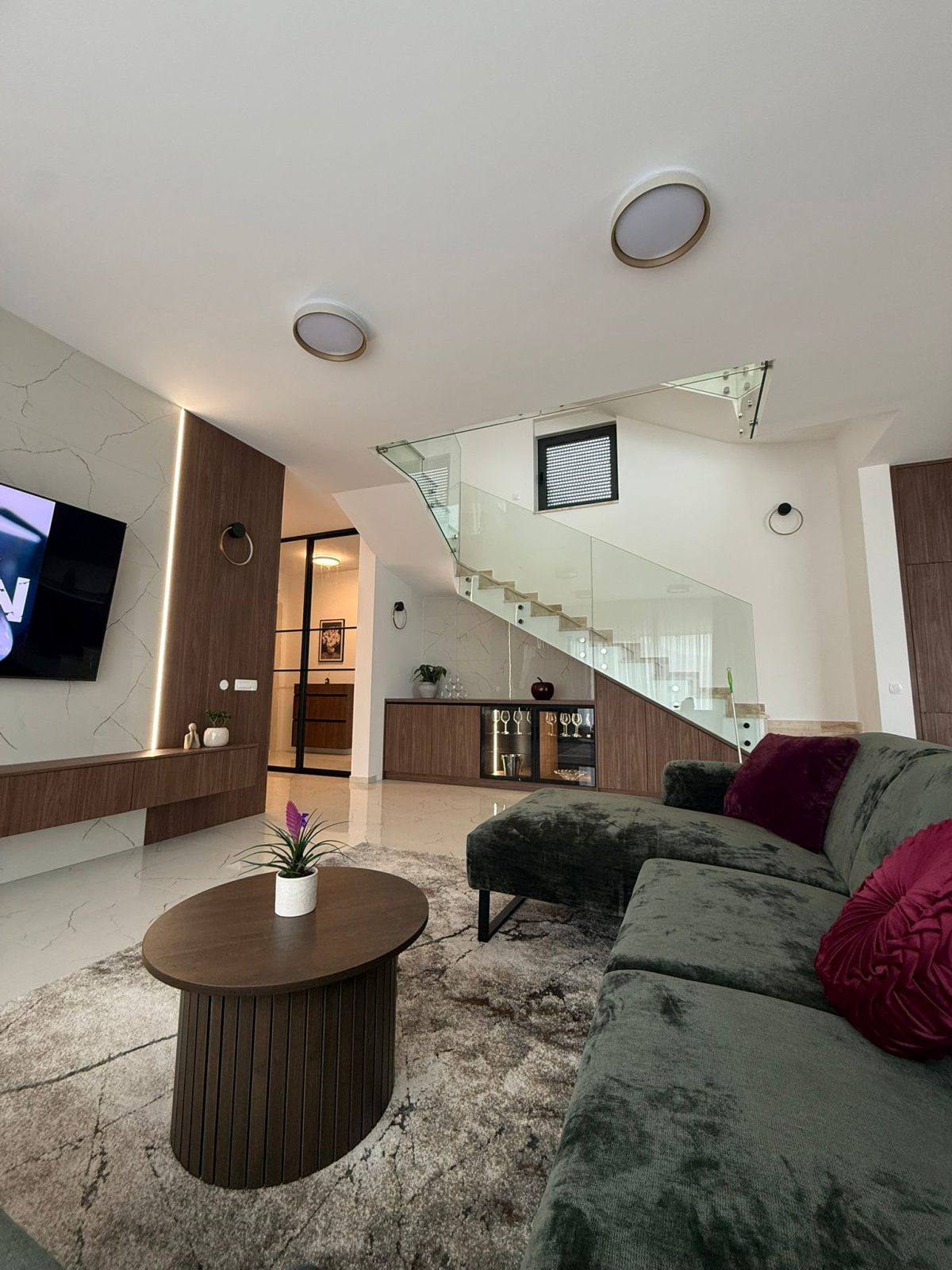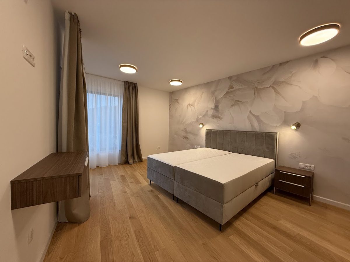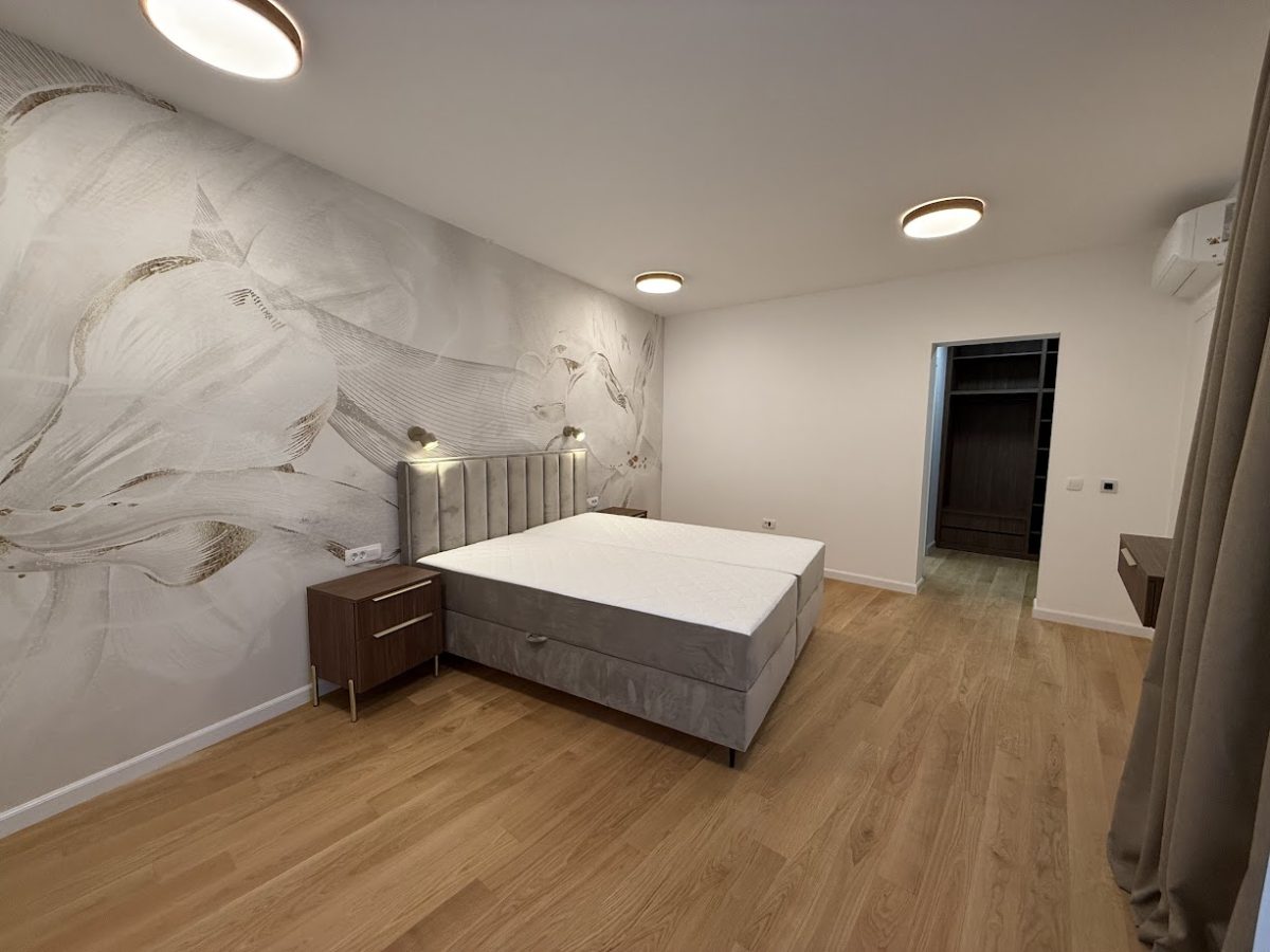 Entrance to this property is on a northern side, located above level of ground floor and getting down the main door area with few steps from the parking lot. In the ground floor is located toilet, storage room, spacious living room with kitchen and big terrace with an amazing infinity pool, summer kitchen and outdoor dining area. Position of sofa and dining table offer stunning sea view through big glass sliding doors. U shaped infinity pool has jacuzzi area with massage pumps and is positioned on same level as ground floor.