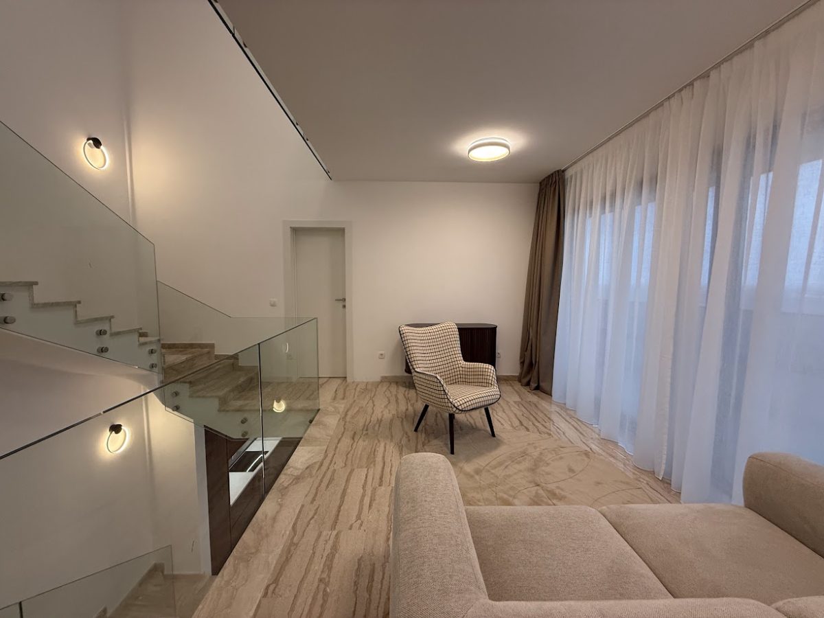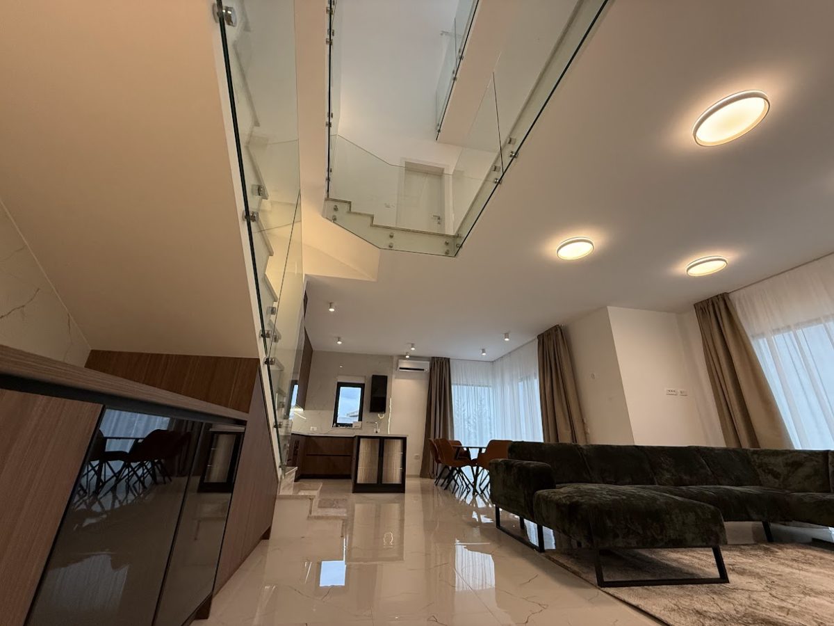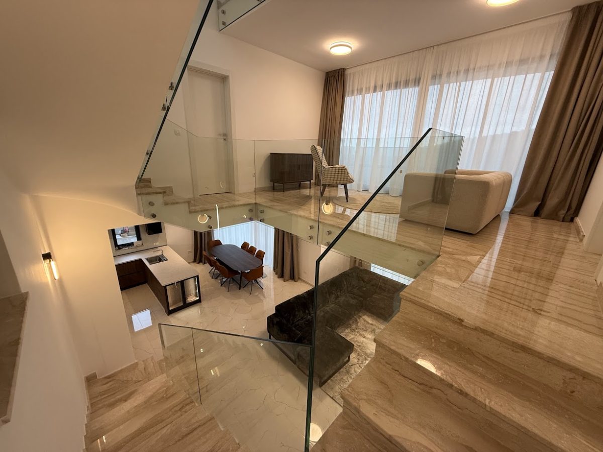 Special feature of interior design is Gallery with flying stainless steel stairs all the way to the second floor with big glass sliding doors on each floor of gallery. First floor offers two En suite bedrooms with long terrace, gallery which can be used as gym or library with big glass door. On second floor is located master bedroom with big terrace and jacuzzi on top to enjoy in marvelous views. Each floor has max height of 3m to enhance luxury of this unique Villa.